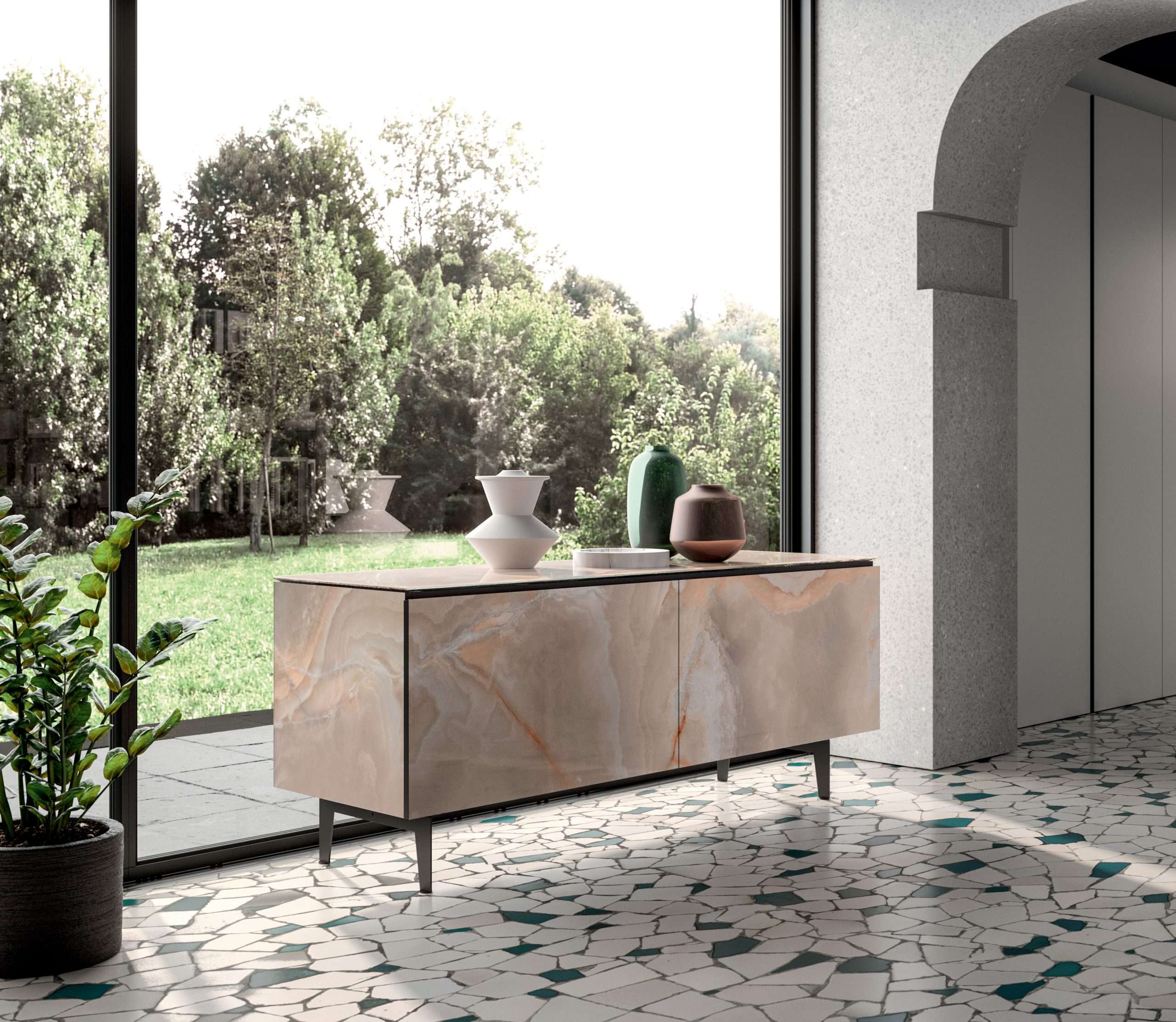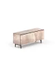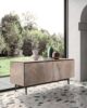 Μπουφές με ομοεπίπεδες πόρτες στο φινίρισμα πολύτιμου μαρμάρου γυαλιού, μεγιστοποιεί τον χώρο με συρόμενες επικαλυπτόμενες πόρτες. Αποθηκευτικός χώρος εξοπλισμένος με γυάλινα ράφια. Ιδανικό για συνδυασμό με τραπέζια 4×4, Fil8 και Random στο ίδιο φινίρισμα.
