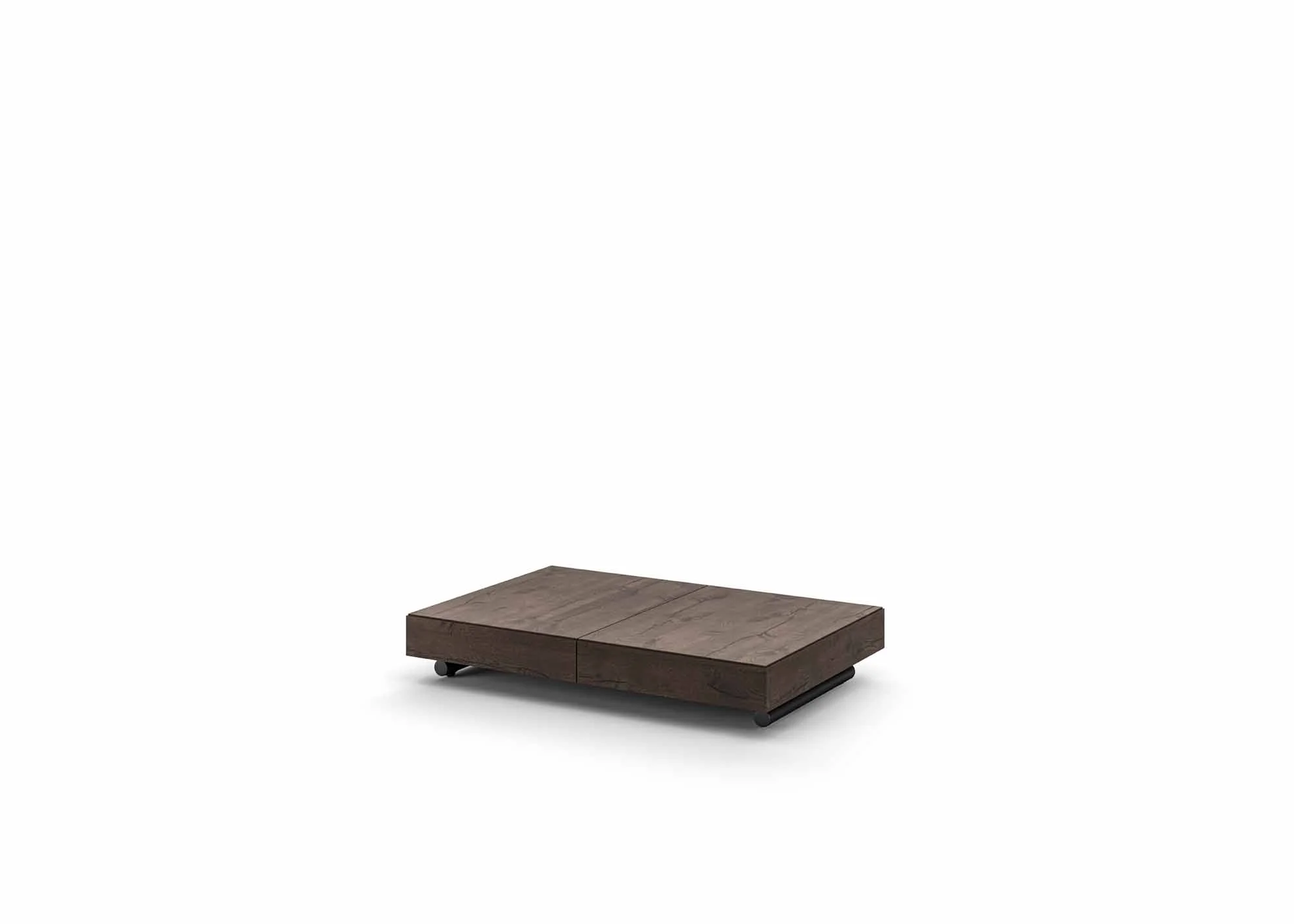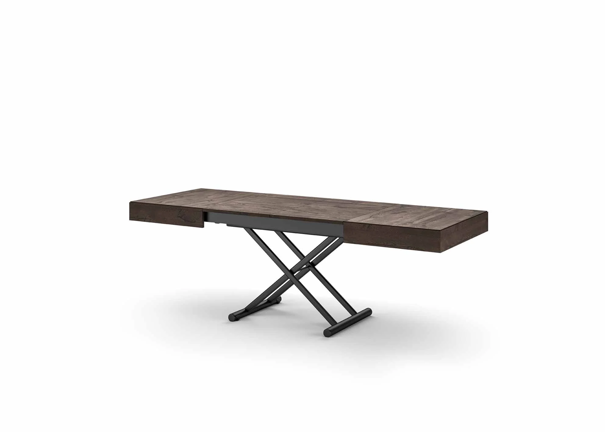 Μετασχηματιζόμενο τραπέζι μεταλλικής βάσης, σύστημα αερίου ανύψωσης λεπτής ρύθμισης από 24 έως 85 cm. Συγχρονισμένο τηλεσκοπικό σύστημα ανοίγματος. Επάνω μέρος, πλαϊνά και προεκτάσεις από οικολογικό ξύλο. 4 ρόδες για εύκολη μετακίνηση.
