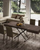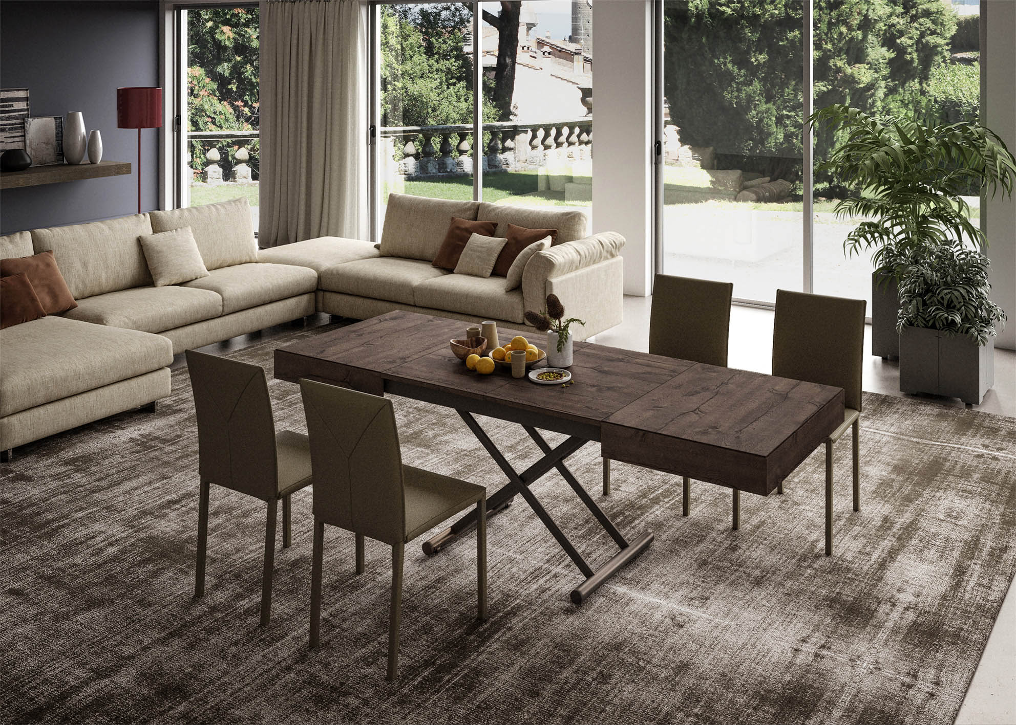 Metal Base transformable table, fine tuning lifting gas system from 24 to 85cm. Synchronized telescopic opening system. Eco-wood top, sides and extensions. 4 wheels for easy movement.