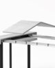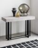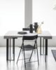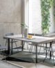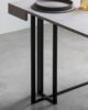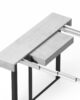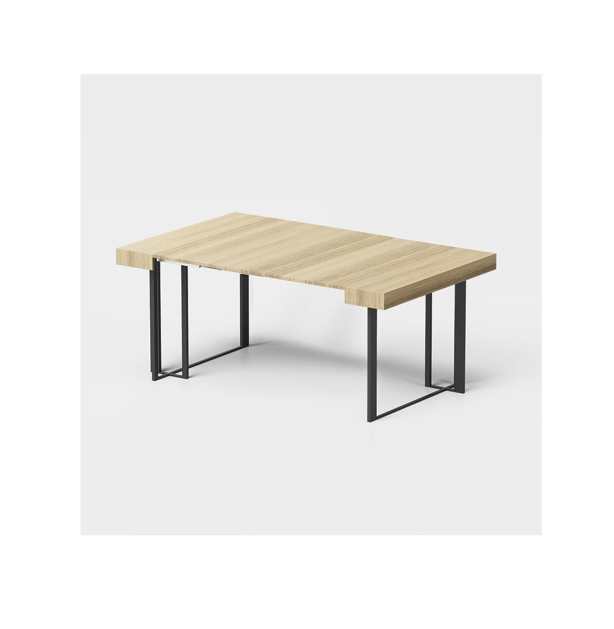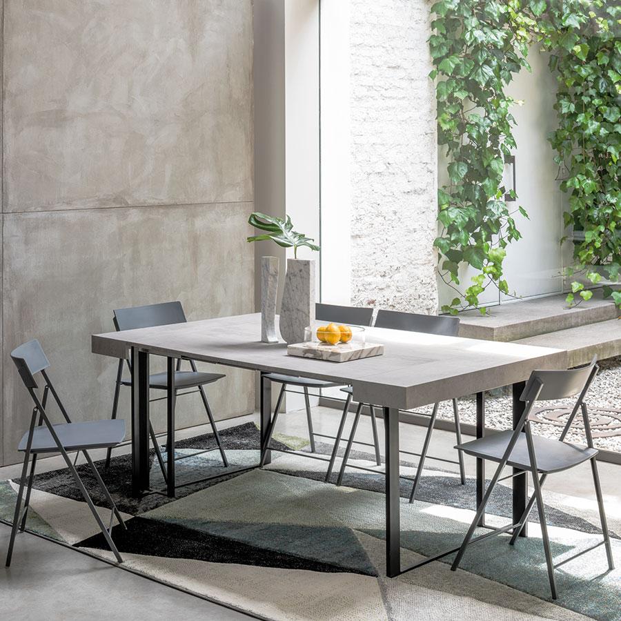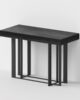 Επεκτάσιμο τραπέζι κονσόλας με αμμοβολή, βαμμένο ατσάλι και φιλικό προς το περιβάλλον πάνω μέρος laminate με διαδικασία αναδίπλωσης. Το τραπέζι συνοδεύεται από 2 προεκτάσεις των 42 cm η καθεμία που βρίσκονται σε ένα δοχείο μέσα στην κατασκευή. Θέσεις: έως 6 άτομα