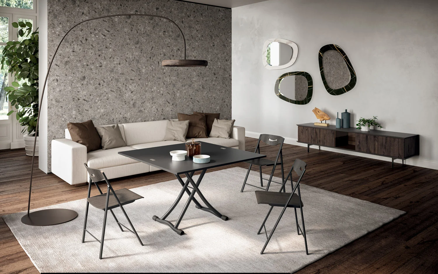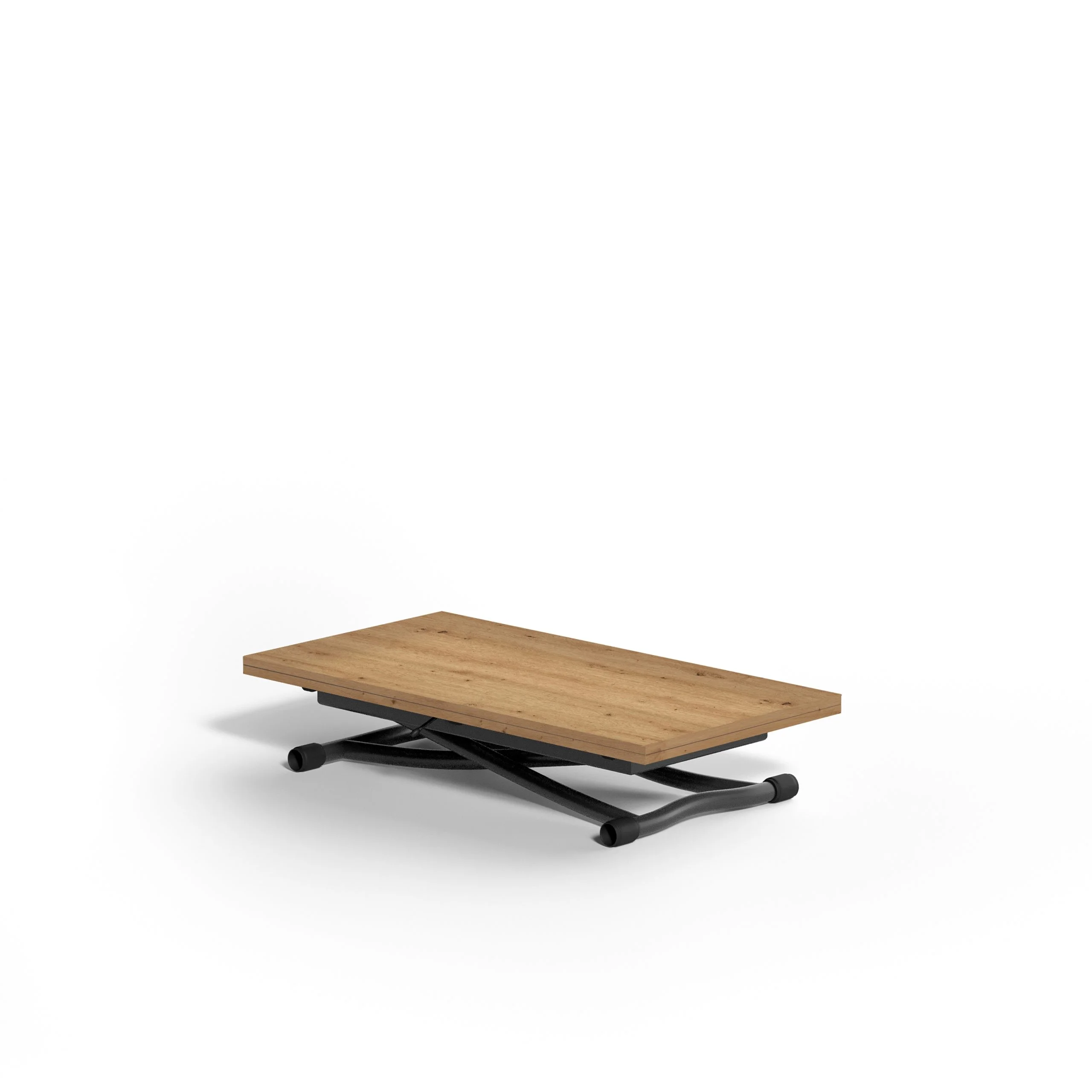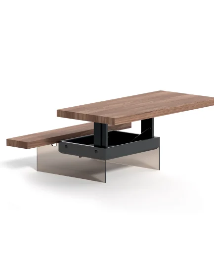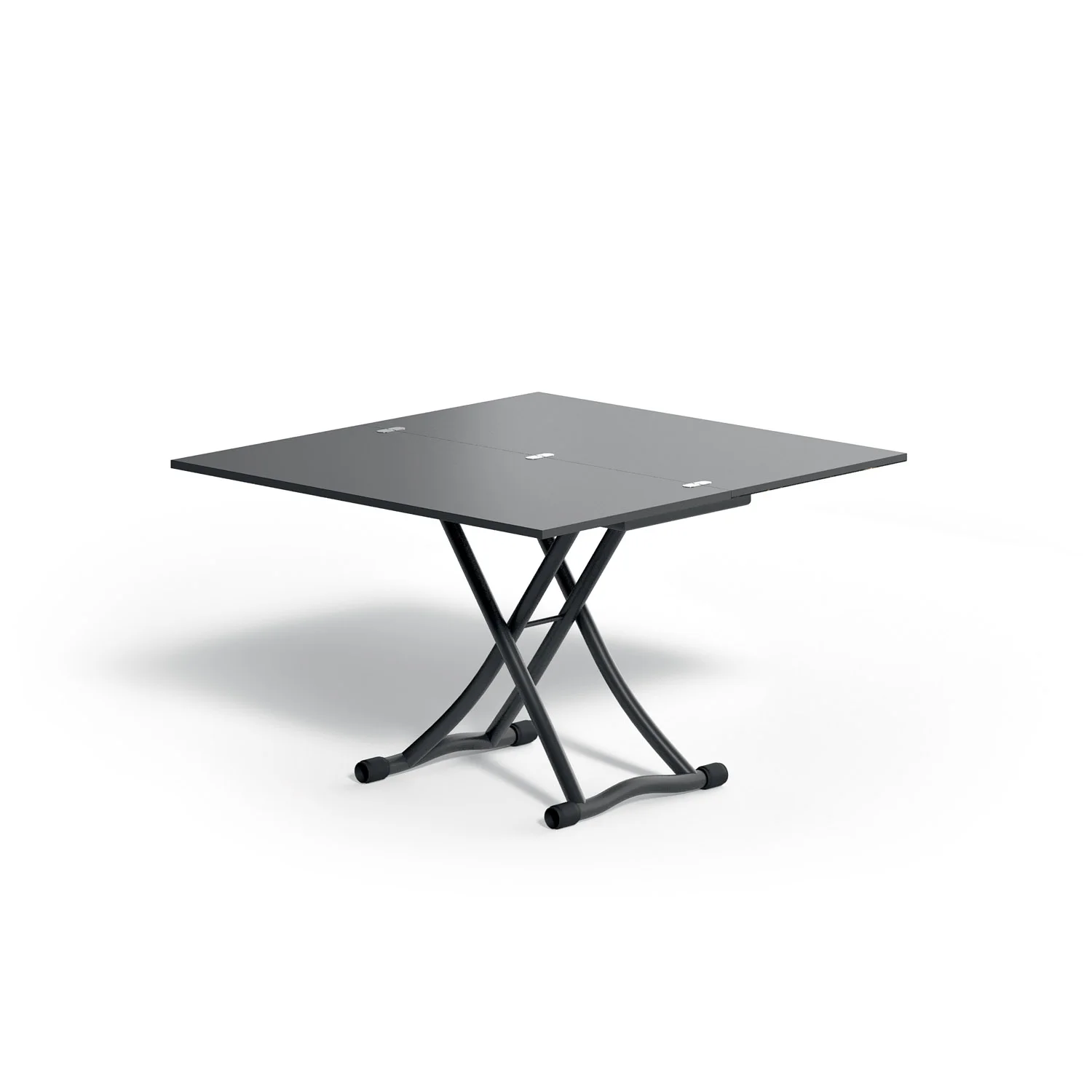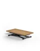 Metal frame transformable table, gas adjustable height from cm 23 to cm 80, synchronised telescopic extension mechanism.