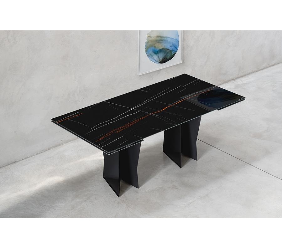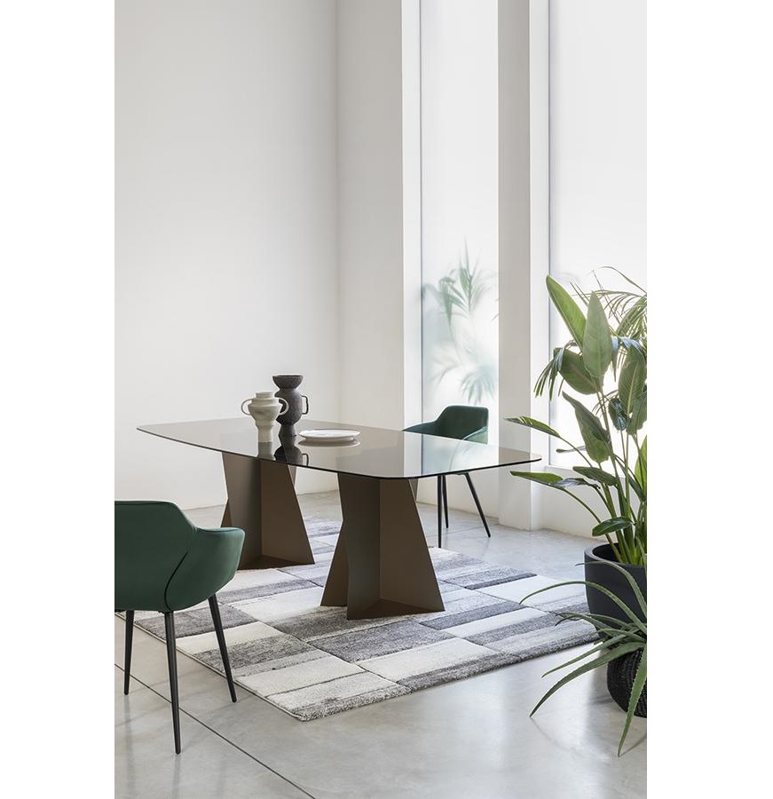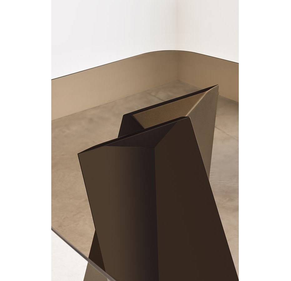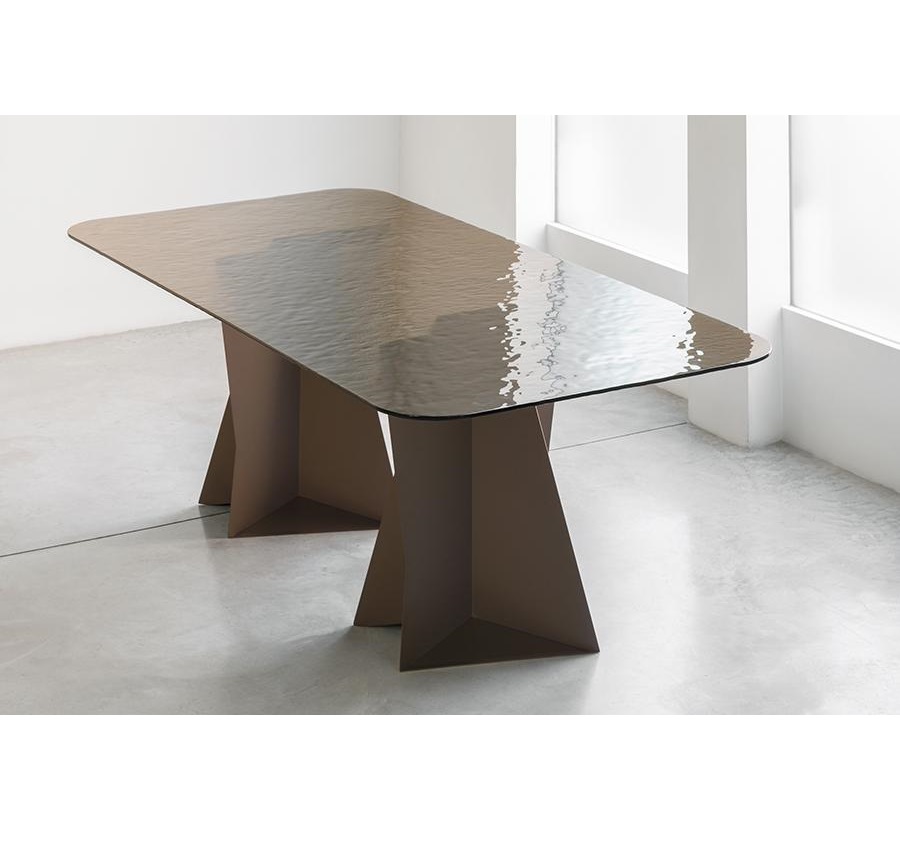 The structure with an original design of this elegant table is made of solid rectangular tubular steel, painted with our sablé finishes, and it goes perfectly with the sophisticated glass tops available in three variants. For the first, there are elegant transparent tempered glass in bronze or smoked grey, 10 mm thick, which allow the imposing structure to shine through. The second is the exclusive hot-forged glass variant, where the same glass (bronze or smoked grey) is heated to the melting point of 740° and pressed to obtain a finely wavy effect which, through mirroring and transparency, recalls the surface of slightly rippled water. As an alternative to the first two variants, there are also innovative extra-clear glass tops digitally printed with Sahara noir, Emperador brown and Calacatta white marble decorations. The shine and reflections of the extra-clear glass, combined with the quality of the very high-resolution printing, make the definition and colours of the marble decoration astonishing.