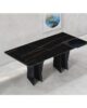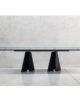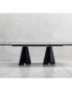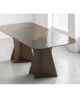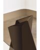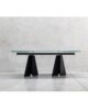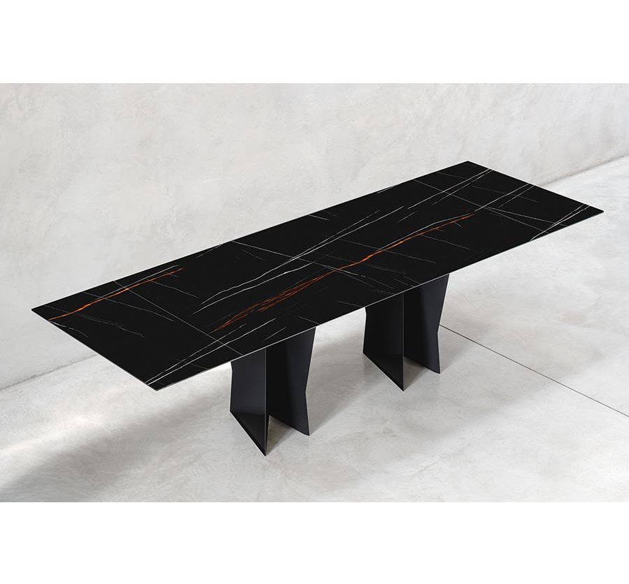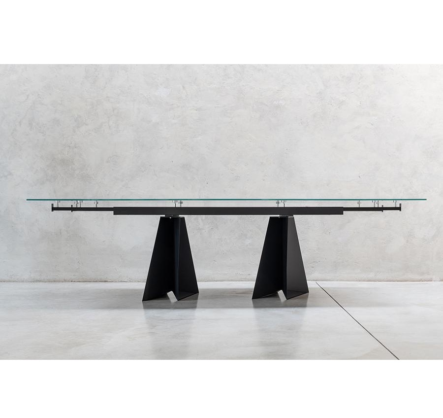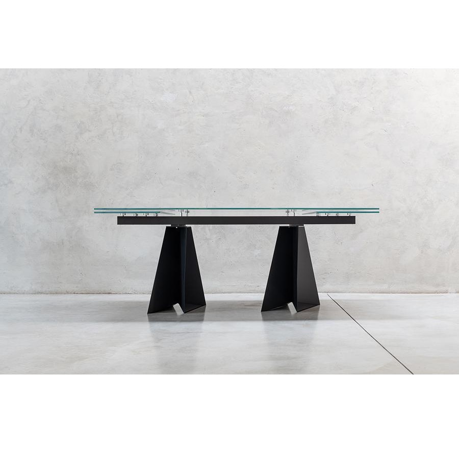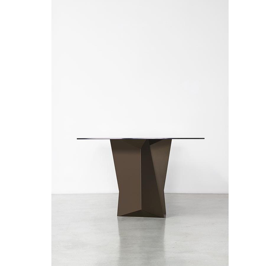 The structure with an original design of this elegant table is made of solid rectangular tubular steel, painted with our sablé finishes, and it goes perfectly with the sophisticated glass tops available in three variants. For the first, there are elegant transparent tempered glass in bronze or smoked grey, 10 mm thick, which allow the imposing structure to shine through. The second is the exclusive hot-forged glass variant, where the same glass (bronze or smoked grey) is heated to the melting point of 740° and pressed to obtain a finely wavy effect which, through mirroring and transparency, recalls the surface of slightly rippled water. As an alternative to the first two variants, there are also innovative extra-clear glass tops digitally printed with Sahara noir, Emperador brown and Calacatta white marble decorations. The shine and reflections of the extra-clear glass, combined with the quality of the very high-resolution printing, make the definition and colours of the marble decoration astonishing.