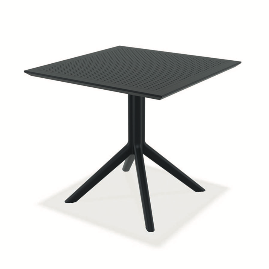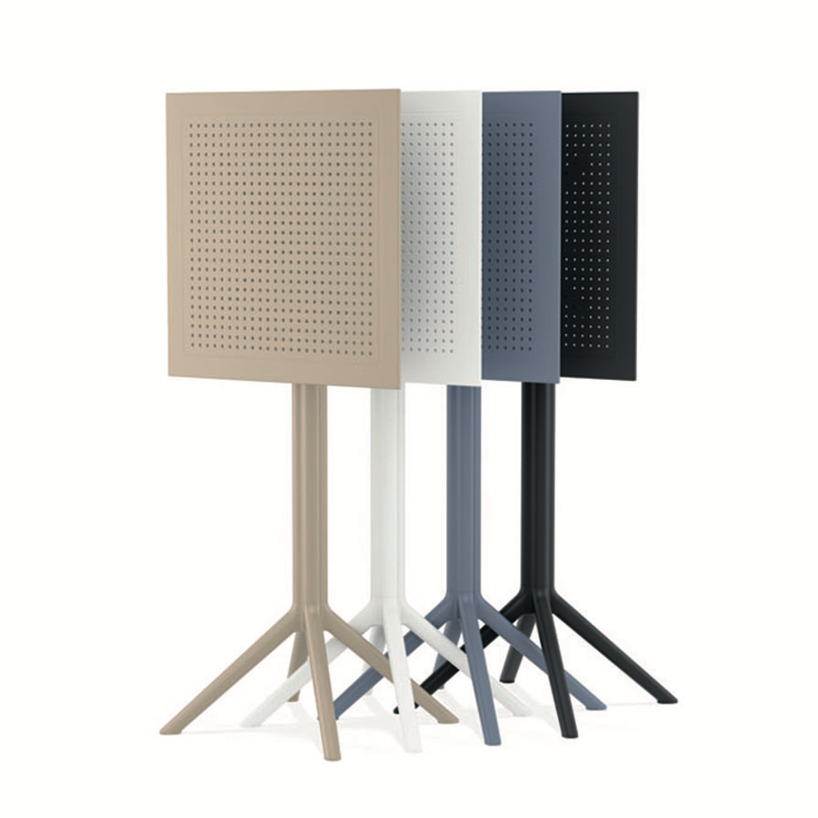 Table with a polypropilene and metal leg, polypropilene and fiberglass top.