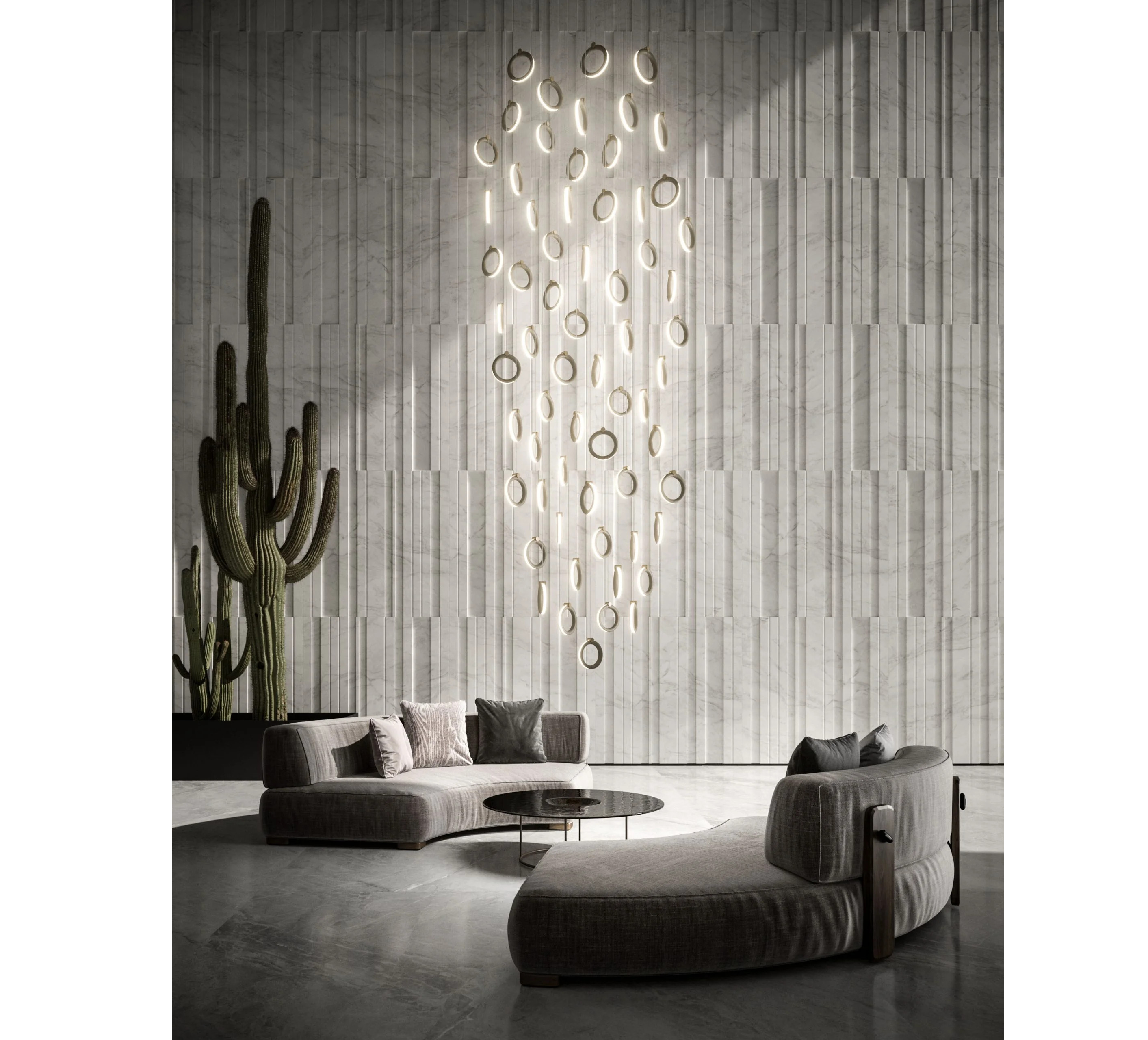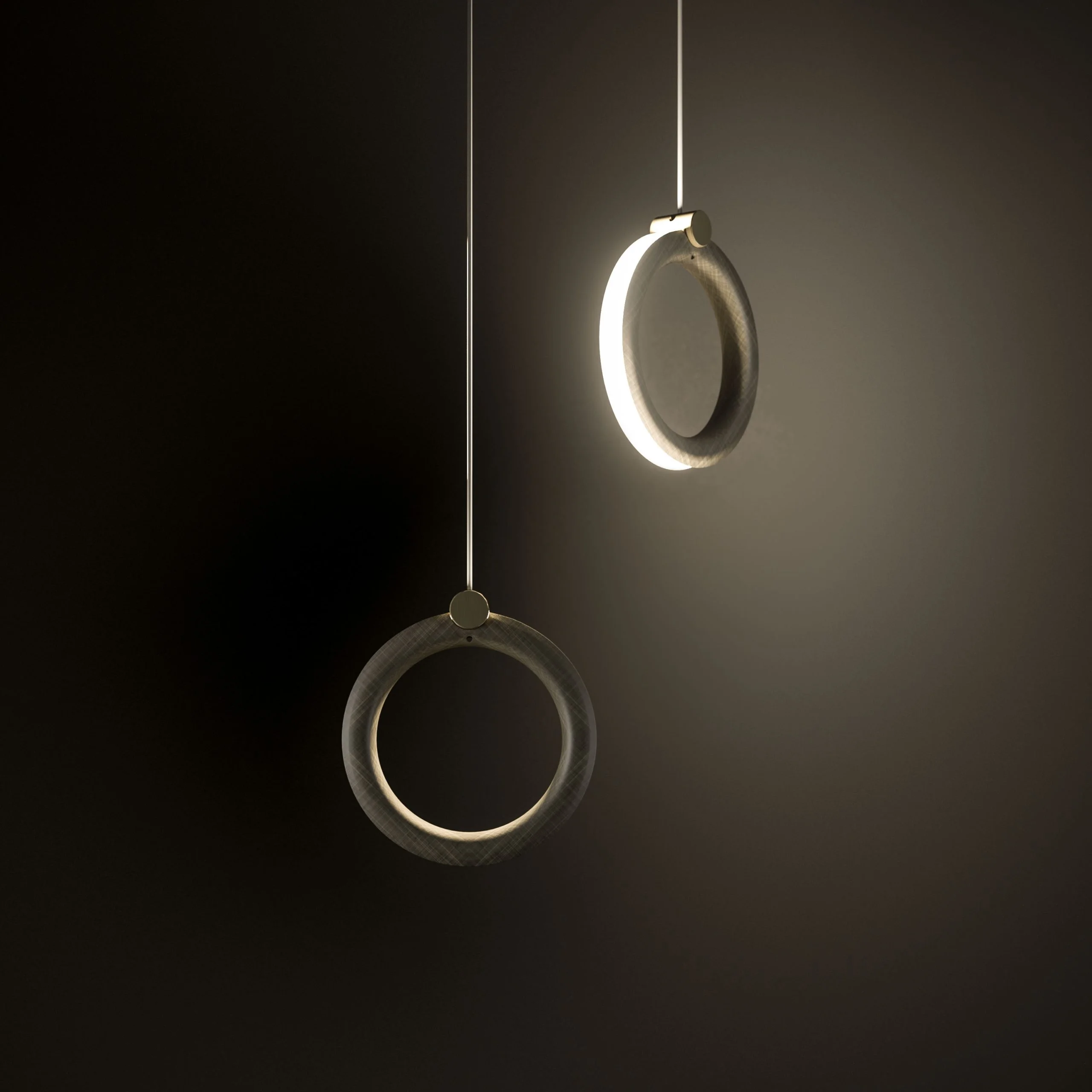 Κρεμαστά φωτιστικά σχεδιασμένα να προσφέρουν τόσο ντιζάιν όσο και πρακτικότητα, που χαρακτηρίζονται από ένα έντονο φως έμφασης. Ταυτόχρονα καθοριστικό και λεπτό, το φως τους βρίσκει το δρόμο του μέσα από τις ρωγμές του δαχτυλιδιού, λάμπει σαν διαμάντι στον βράχο, γίνεται το επίκεντρο του δωματίου και δίνοντας σημασία σε κάθε λεπτομέρεια του οικιακού περιβάλλοντος.