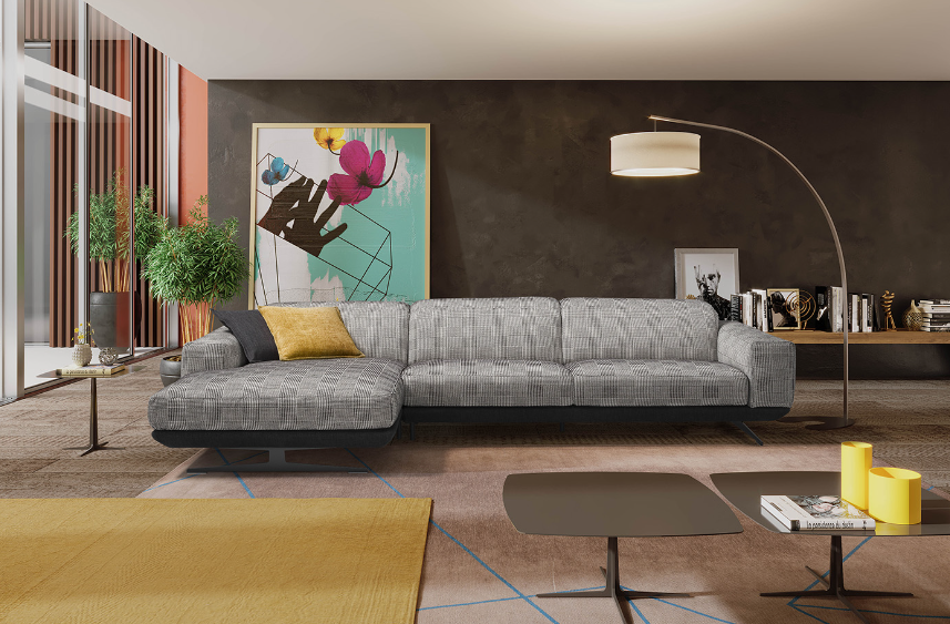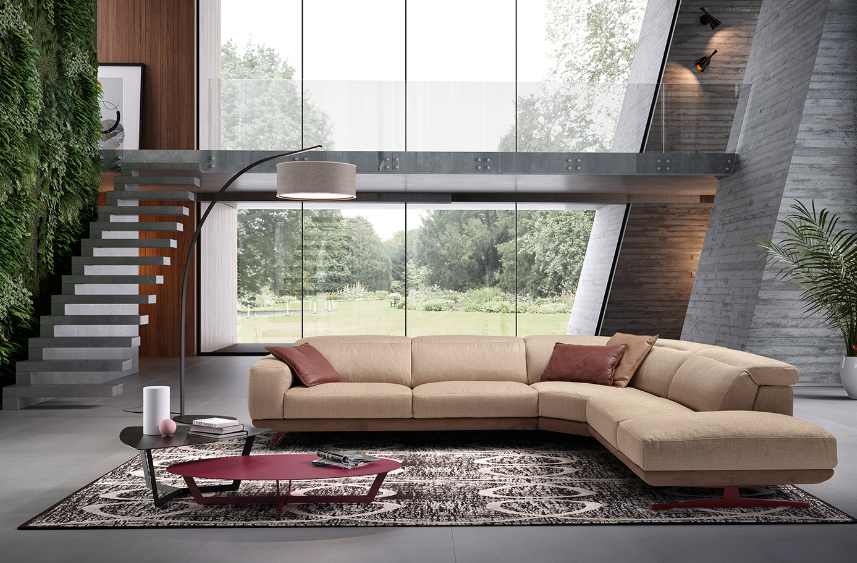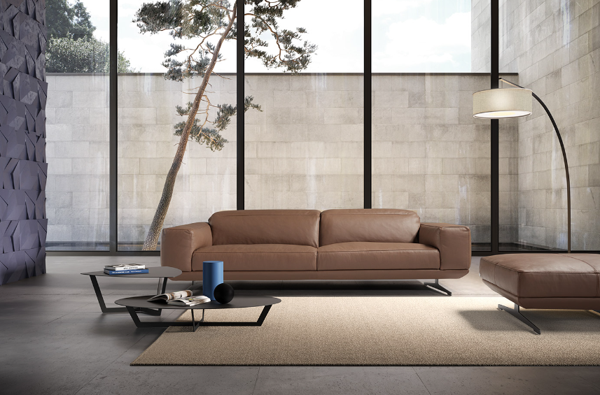 GLORIA is the relaxation sofa with an industrial and contemporary style with a high steel base and different finishes. Modern with its linear shapes and very spacious thanks to its generous seats, the GLORIA sofa will bring everyone together in the living room.